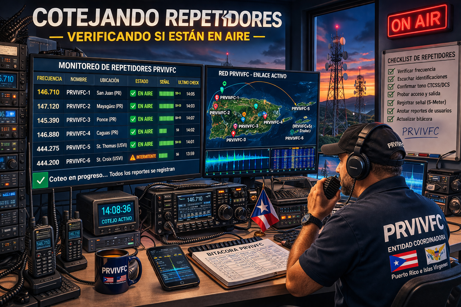 ✓ Los miembros de la Junta localizarán diferentes lugares altos en los cuatros puntos cardinales de nuestra Isla para cotejar y verificar las frecuencias coordinadas. Este año aquellas frecuencias verificadas que no estén en el aire se realizará una segunda verificación para estar seguro de no cometer alguna injusticia vamos a ir directamente al pueblo donde se localiza el repetidor según el directorio.