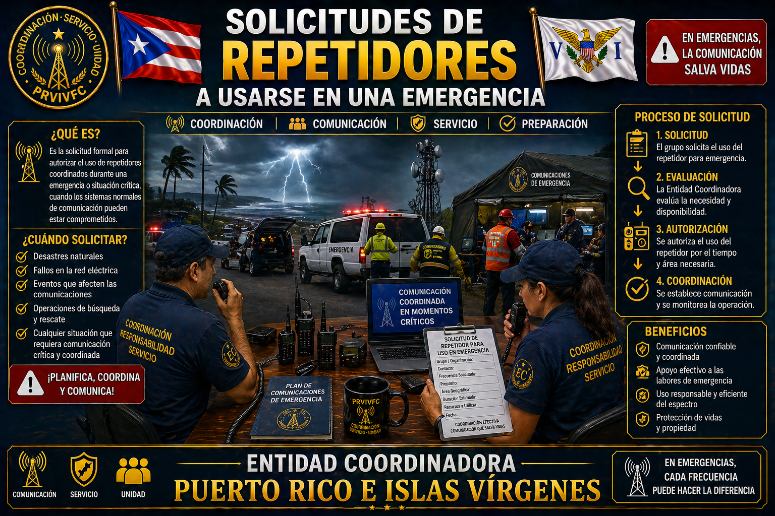 Este formulario tiene el propósito de recopilar la información necesaria en forma voluntaria aquellos repetidores que con la autorización del trustee puedan usarse en caso de alguna emergencia emitida por las agencias correspondientes del gobierno de nuestra Isla de Puerto Rico. Es importante que los repetidores tengan respaldo de emergencia como generador portátil, baterías y sistemas de energía renovable. La Comunidad de radioaficionados va estar agradecida por permitir el uso de su sistema para trabajar cualquier tipo de emergencia. El propósito de esta iniciativa es para que los diferentes grupos de radioaficionados que trabajan las diferentes emergencias puedan tener un banco de repetidores disponibles y para cuando el gobierno active a los radioaficionados tengan una idea de que repetidores puedan usar. Se preparan un listado especial que indique la información suministrada voluntariamente por los trustee.
