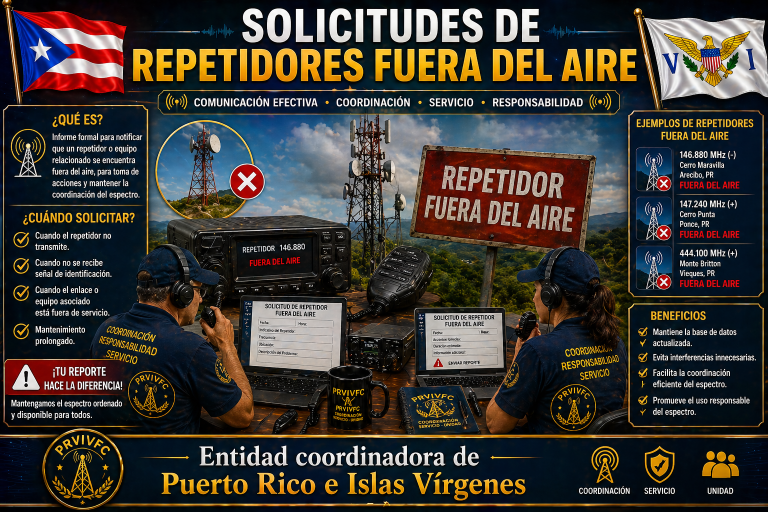 En esta sección es dedicada a la comunidad de usuarios que usan los diferentes repetidores de Puerto Rico e Islas Vírgenes con el fin de informar en forma voluntaria si algún repetidor está fuera del aire (OFF AIR) para que el PRVIVFC pueda verificar si la información suministrada es cierta. No se requiere ninguna información personal de la persona que informa sobre algún repetidor que no tenga actividad en el aire. La información recopilada es estrictamente confidencial. En el enlace usted llenará un formulario sencillo y rápido para poderlo enviarnos a la entidad coordinadora para que verifique si la información es válida.